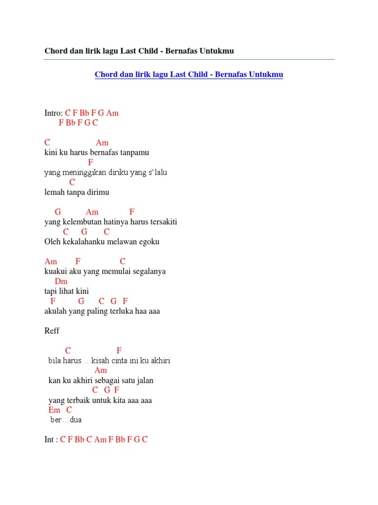 Includes midi and pdf downloads. Ku tak ingin engkau terluka. Ku harus berhenti bernafas tanpamu yang meninggikan diriku yang selalu lemah tanpa dirimu yang kelembutan hatinya harus tersakiti oleh kekalahanku melawan egoku. Dbmkini ku harus bernafas tanpamu. G am f yang kelembutan hatinya harus tersakiti c g c oleh kekalahanku melawan egoku. Hai semuanya, terima kasih buat temen2 yang sudah request lagu. C am kini ku harus bernafas tanpamu f yang meninggikan diriku yang s'lalu c lemah tanpa dirimu. Kini ku harus bernafas tanpamuyang meninggikan diriku yang selalulemah tanpa dirimuyang ke lembutan hatinya harus tersakitioleh kekalahanku melawan egoku ku akui aku yang memulai s'galanyatapi lihat kini akulah yang paling terluka bila harus kisah. G yang merelakan hidupnya yang selalu. G+g yang meninggikan diriku yang s'lalu. Gyang meninggikan diriku yang s'lalu. D a d oleh kekalahanku. Last child bernafas tanpamu terbaru gratis dan mudah dinikmati.