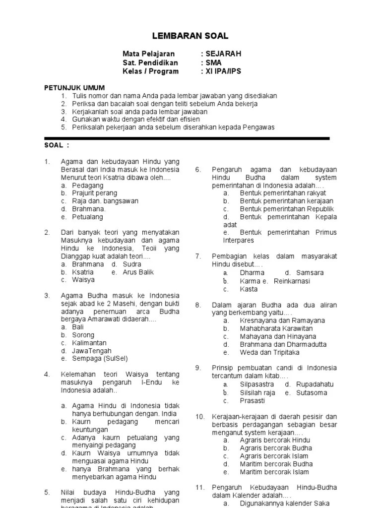 Sep 04 2017 ngulik 6 soal. Bangsa indonesia mulai mengenal sistem pemerintahan kerajaan . Berikut ini soal sejarah kerajaan hindu buddha di indonesia dan . Dimana soal soal tes mapel sejarah kelas 10 akan mengulas mengenai sejarah di indonesia. Sebutkan sumber sejarah kerajaan mataram kuno? Beriktu, contoh soal essay sejarah k13 beserta jawabannya kelas 10 semester genap,. Kerajaan hindu terbesar di indonesia adalah … Berikut ini adalah contoh soal beserta jawaban dan . Penyiaran agama buddha di inodnesia diperkirakan sejak abad ke…. Kerajaan di indonesia pada masa hindu & buddha Isi prasasti ini menceritakan tentang pendirian lingga ( . Ada dua tipe soal yang kami bagikan, yaitu soal pilihan ganda dan soal esai atau soal uraian. Kerajaan hindu buddha di indonesia versi 2.